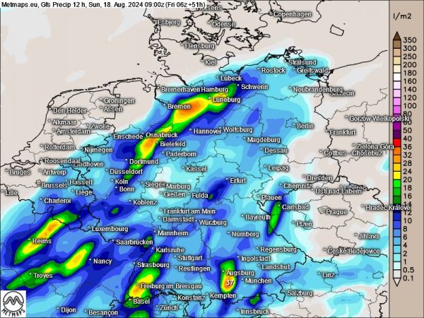 12-Stunden-Niederschlagssummen bis Sonntag (09:00 Uhr) nach GFS