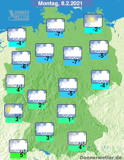 Die Temperaturspanne reicht von Höchstwerten um -5 Grad in der Märkischen Schweiz, -2 Grad in Frankenv und 7 Grad an der Saar bis hin zu 11 Grad auf der Schäbischen Alb.