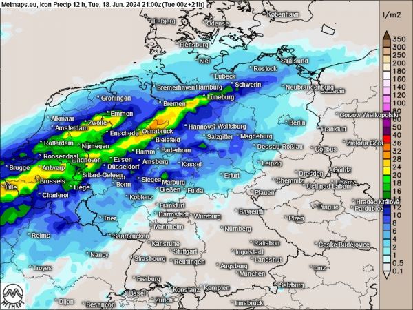 Einerseits ist in den nächsten Stunden auf einem Streifen von den Niederlanden über das Münsterland, die Lüneburger Heide und nachts auch in Mecklenburg-Vorpommern mit gewittrigem Dauerregen zu rechnen.