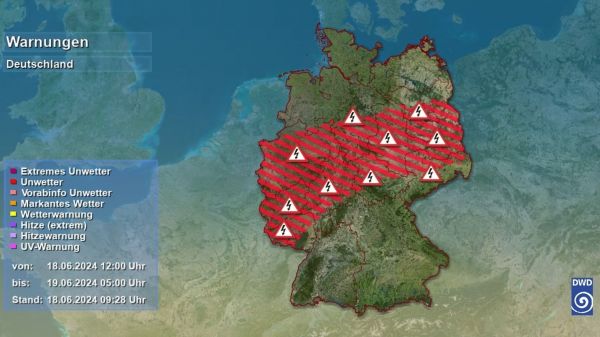 Für den heutigen Dienstag liegt eine Unwettervorwarnung des DWD für den Westen und Südwesten, der Mitte und den Osten Deutschlands vor.
