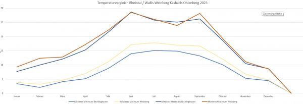 Im Jahr 2023 lagen die Höchsttemperaturen zwar nur um wenige Zehntel Grad über denen des Rheintals; allerdings war es im Weinberg in den Nächten um fast 2 Grad wärmer als "unten".