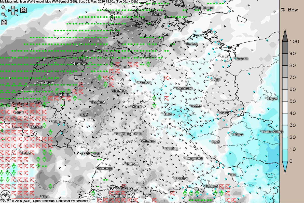 Die Wetterkarte mit Gewittern (rote Symbole) für Sonntagabend (18:00 Uhr) nach ICON: