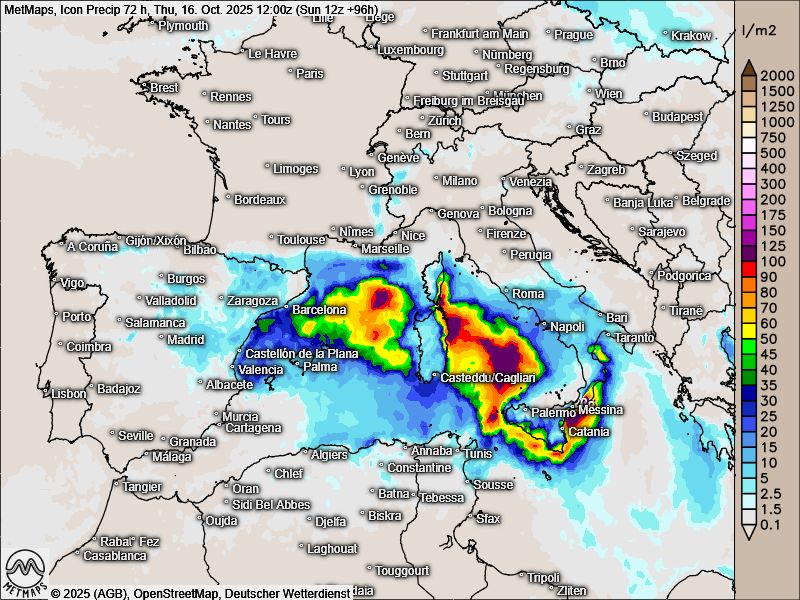 Ein kleiner Kaltlufttropfen zieht über die Balearen nach Sardinien und Sizilien.