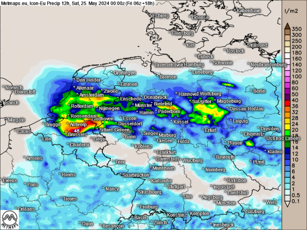 In den Nachmittagsstunden setzen sich zum Teil kräftige Niederschläge vor allem noch vom Ruhrgebiet bis nach Sachsen fort. Auch in BeNeLux bleibt es sehr nass. Lokal sind auch Gewitter möglich.