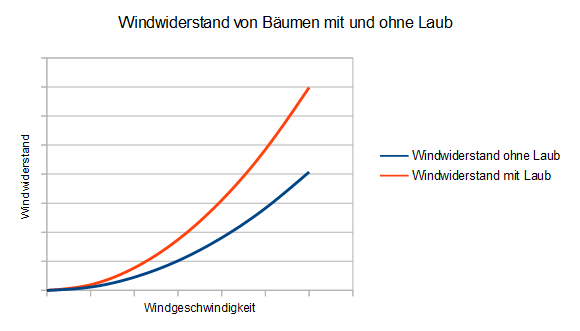 Die Grafik zeigt die sich unterscheidenden Windwiderstände von Bäumen mit und ohne Laub bei zunehmender Windgeschwindigkeit.