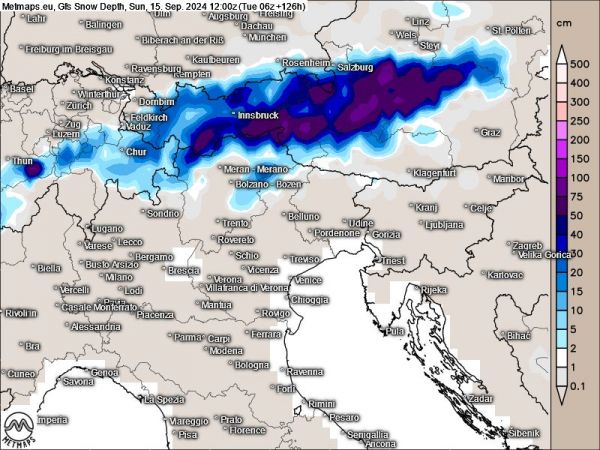 Auf der folgenden Karte ist die nach GFS berechnete Neuschneemenge bis Sonntag (12:00 Uhr) zu sehen.