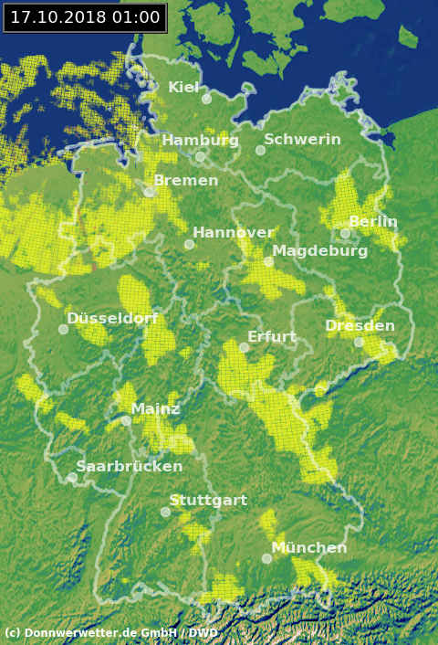 Das Radarbild zeigt aktuell zwar schwache Signale, um Niederschlag handelt es sich hierbei aber nicht. Sonst präsentiert sich der Himmel über Deutschlands häufig sternenklar oder nur leicht bewölkt. Nur im Norden sind die Wolken teilweise etwas dichter. Stellenweise haben sich hier auch Nebelfelder gebildet.