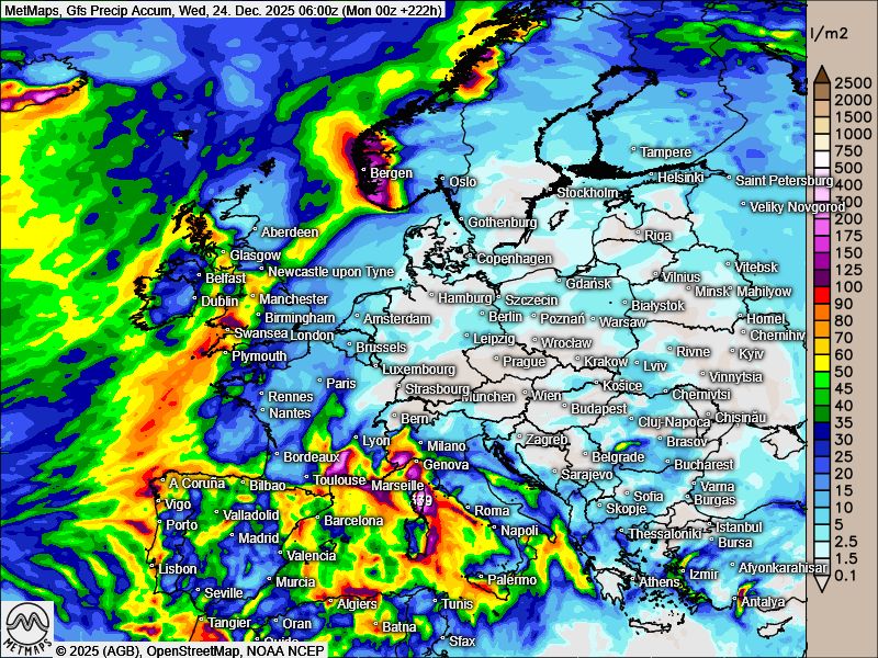Die akkumulierten Regenmengen bis Heiligabend sowie die Strömungskarte Mitteleuropa / Wetterkarte Deutschland für Heiligabend nach GFS: