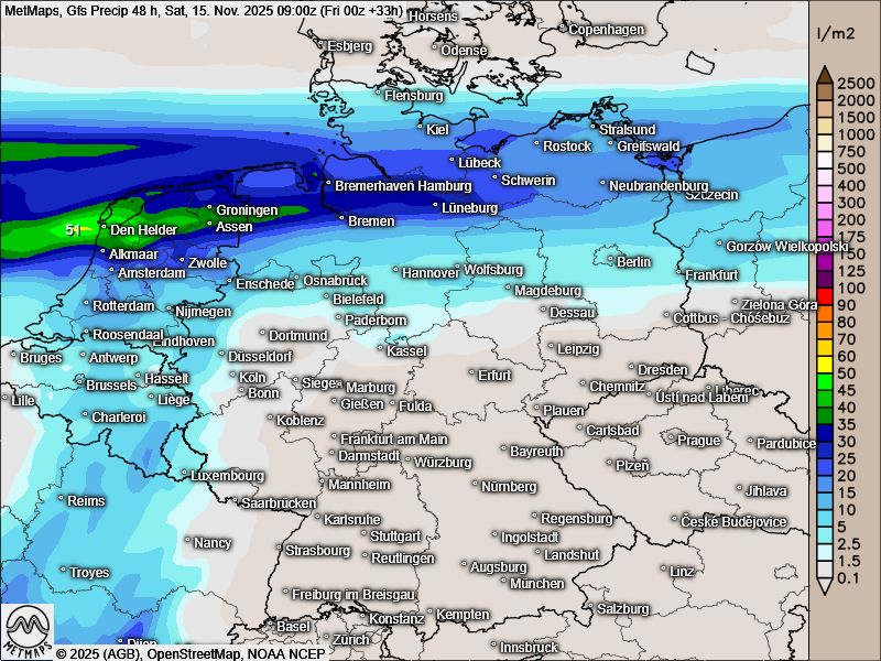 Am heutigen Freitag wird es an Nord- und Ostsee bereits schon deutlich kühler. Hier an der Wettergrenze regnet es sich dabei schon ein: Für Freitag und Samstag können Regenmengen bis zu 40 l/m² zusmmenkommen.