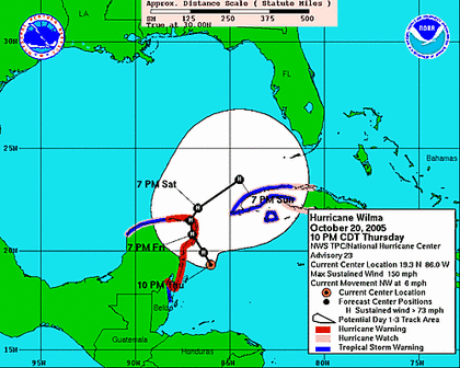 Danach wird 'Wilma' wahrscheinlich nach Nordosten abredehn und dann am Montag über Florida hinwegziehen. Bis dahin wird er sich etwas abgeschwächt haben. Auf seinem Weg könnte er dann auch dem Westen Kubas bedrohlich nahe kommen.