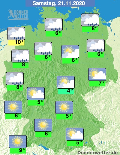Der Freitag hat dann insgesamt zwar wieder deutlich mehr freundliche und trockene Phasen mit im Gepäck, die Tageshöchstwerte erhalten aber nochmals einen Dämpfer. Zweistellige Plusgrade sind Geschichte, die Temperaturen pendeln sich am Nachmittag bundesweit bei Werten um 6 bis 8 Grad ein.