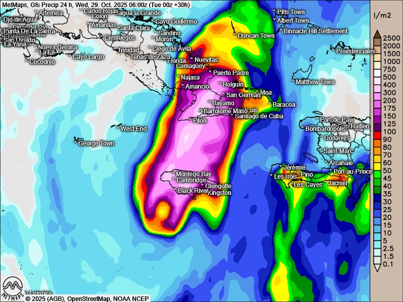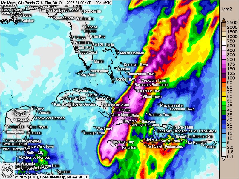 Hurrikan "Melissa" zieht von Jamaika über Kuba und die Bahamas hinweg; dabei sind beachtliche Regenmengen zu erwarten: Über Jamaika kommen nach aktuellen Modellrechnungen innerhalb von 24 Stunden bis zu 700 l/m² zusammen.