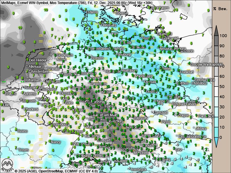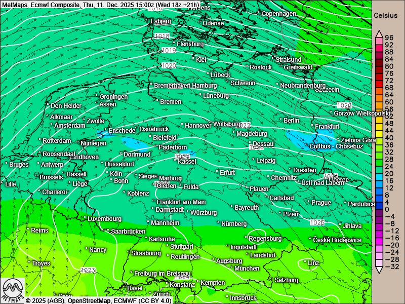 Die Strömungskarte für Donnerstagnachmittag sowie die Wetter- / Temperaturkarten für Donnerstagnachmittag und Freitagfrüh nach ECMWF: