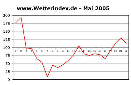 Zunächst ging es sehr warm und sonnig in den Mai - der Index stieg auf Werte um 190 Punkte. Doch dann sackte er unter die 100-Punkte-Marke, am 7. Mai sogar unter 20 Punke. Erst am 13. Mai konnte der Index wieder die 100-Punkte überschreiten, seitdem herrscht eher durchschnittliches Wetter. Und nun geht es langsam aufwärts...