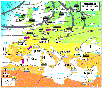 Auf einer Wetterkarte werden zunächst die Linien gleichen Luftdrucks, die Isobaren eingezeichnet. So erhält der Meteorologe einen Überblick über die Verteilung von hohem und tiefem Luftdruck. Mit Hilfe der Wettermeldungen vieler Wetterstationen werden noch Wetterfronten eingezeichnet. So kann auch der Laie sehr schnell erkennen, wo Gebiete schlechten und schönen Wetters zu finden sind.