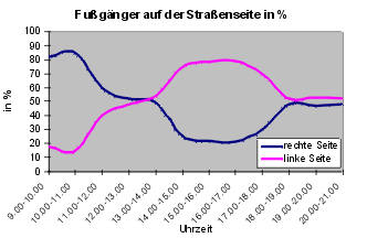 Die Grafik zeigt die Anzahl der Fußgänger am 26.7.2005 am Aalen-bulevar in Antakya. Die linke Straßenseite lag bis ca. 11.30 Uhr in der Sonne. Danach wurden beide Straßenseiten bis 14 Uhr in etwa gleich stark von der Sonne beschienen. Ab 14 Uhr lag überwiegend die rechte Straßenseite in der Sonne, bevor ab 18.00 Uhr beide Seiten kaum noch Sonneneinstrahlung erhielten. Bewölkung war an diesem Tag nicht am Himmel über der Stadt. Die Temperatur stieg am Vormittag und Mittag stark an und erreichte gegen 14-15 Uhr mit 33 Grad den Höchstwert.